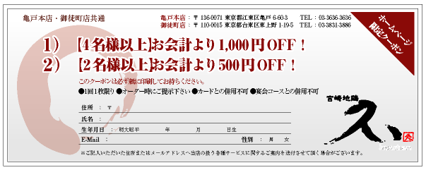 ●「HPを見た」でクーポン内容がご利用いただけます。 1 )【 4 名様以上】お会計より 1,000 円 OFF !(総額5,000円以上後利用の方が対象) 2 )【 2 名様以上】お会計より 500 円 OFF ! (総額3,000円以上後利用の方が対象) ※ 1 回 1 枚限り ※オーダー時にご提示下さい ※カードとの併用不可 ※宴会コースとの併用不可